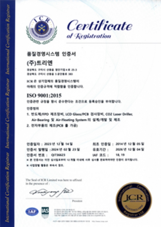 메인비주얼 영역 以创新的意识进行技术开发 创造未来价值并为国家发展贡献。 Read More Products 超精密气浮轴承平台 Read More FPD Stage Read More Inspection M/C Read More 气浮系统 Read More Vacuum Chuck Read More 有关陶瓷的材料,部件技术 · 多孔陶瓷生产技术 · 利用多孔陶瓷的真空吸盘生产技术 · 电阻控制多孔陶瓷生产技术 · 电阻控制多空陶瓷真空吸盘生产技术 · 利用其它陶瓷的产业部件化技术 Air Bearing 技术 · Orifice Type Air Bearing 设计及生产技术 · Porous Type Air Bearing设计及生产技术 · Vacuum Preload Air Bearing设计及生产 · Orifice & Porous Air Floating System 技术 · Vacuum Chuck设计及生产技术 超精密设备技术 · Nano级 Air Bearing Stage 设计/生产 技术 · Single Plane 超精密 Air Bearing Stage · 大面积 Air Bearing Stage 设计/生产 · Glass Inspection 设备设计及生产技术/li> · 高真空对应型超精密平台生产技术 认证 通过创新、革新的研究开发以及关注于质保的TriN研发部。 Read More 地址 ADD 25-3 Cheomdangieop- 4-ro, Sandong-myeon, Gumi-si, Gyeongsangbuk-do, Korea TEL +82-54-715-7100 FAX +82-54-715-7101 EMAIL sale@tri-n.co.kr 客户咨询 客户咨询 작성품 公司 地址 名氣 * 电子邮件 * 联络处 内容物 同意个人信息处理方针。 * 查看条款 编写