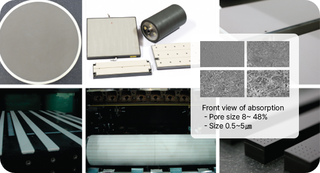 - 抗静电多孔陶瓷 (Anti-static Porous Ceramic) 控制气孔大小 (1~20㎛)和 气孔率(10~48%), 应用于Air Bearing, Ceramic Chuck和 FPD用 chuck & Air-floating system 通过控制电阻,能够具备抗静电特性